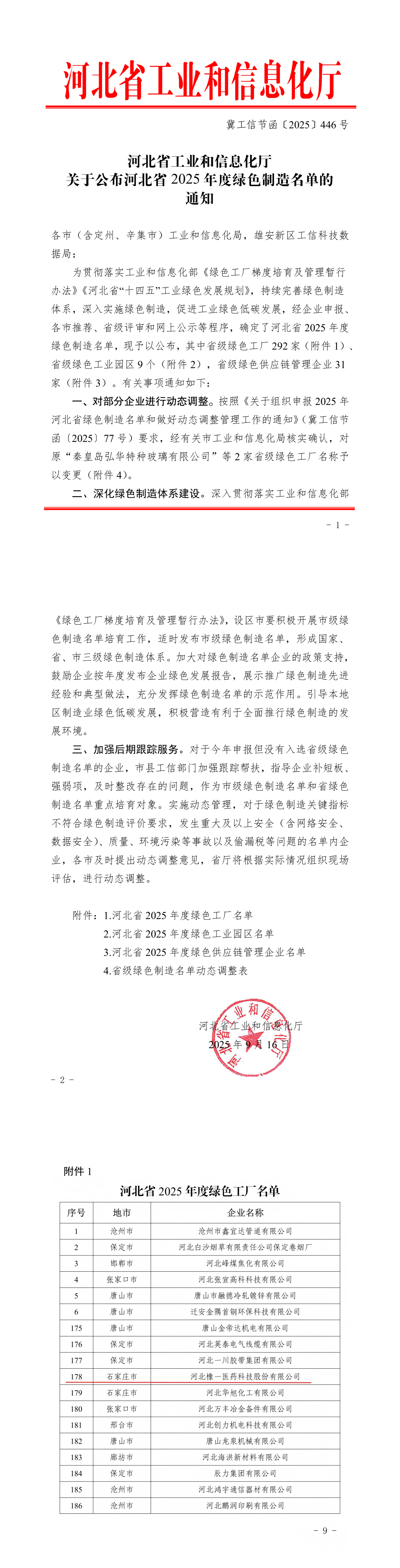 近日,河北省工业和信息化厅正式对外发布 2025 年度省级绿色制造名单,河北橡一医药科技股份有限公司(以下简称 “橡一科技”)凭借在绿色制造、节能减排和可持续发